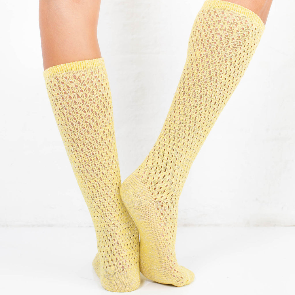 Skønne lange strømper med hulmønster og glimmertråd. Flotte og trendy strømper – er fine til både sneakers og stiletter.