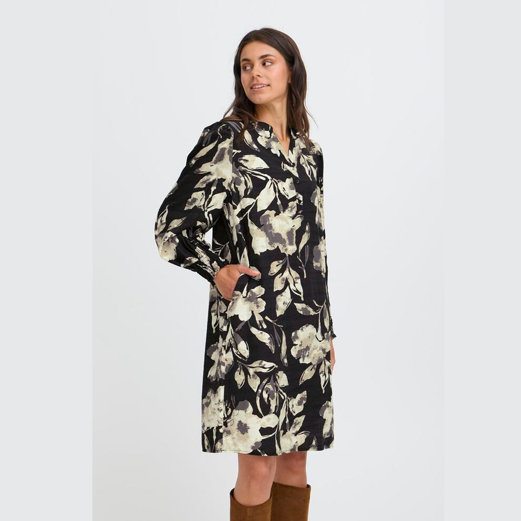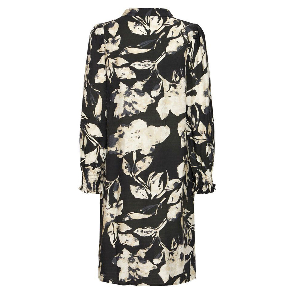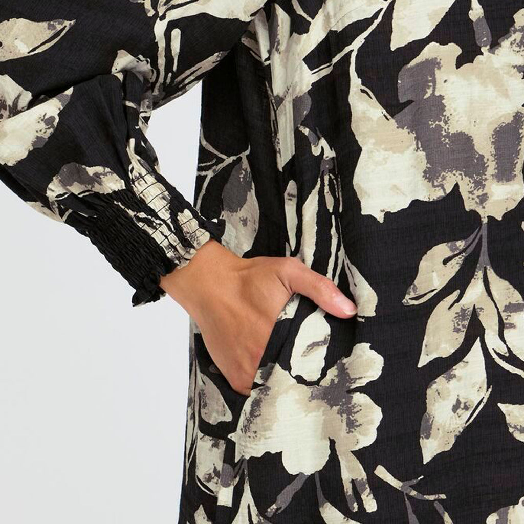 Fin løsthængende kjole fra Fransa i et flot mønster. Kjolen går ned til knæet og lang lange ærmer med smock samt en fin stolpelukning med knapper. Kjolen har lommer.