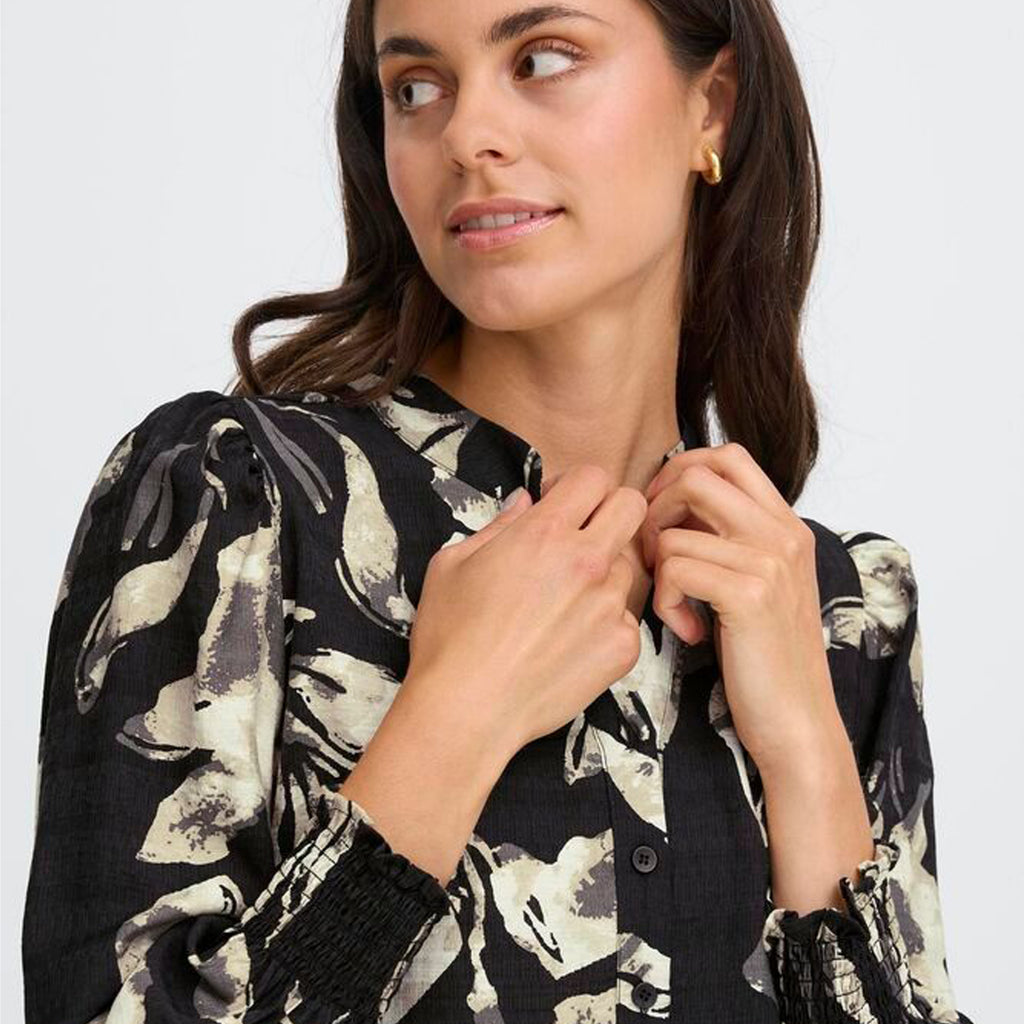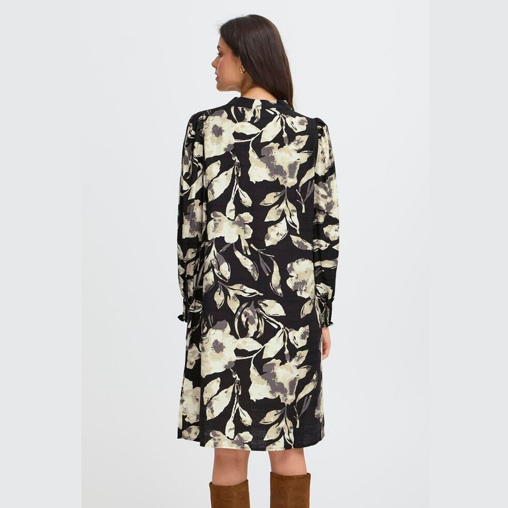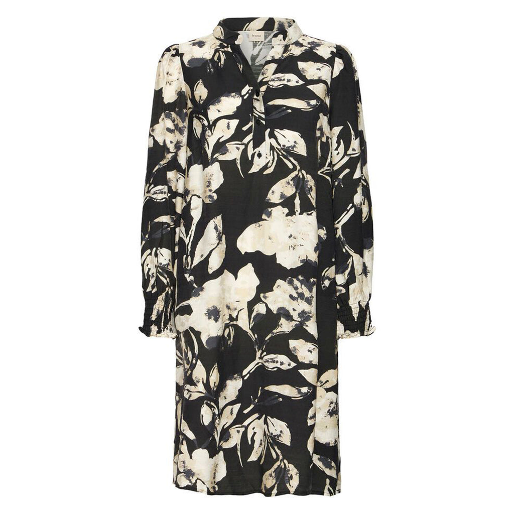 Fin løsthængende kjole fra Fransa i et flot mønster. Kjolen går ned til knæet og lang lange ærmer med smock samt en fin stolpelukning med knapper. Kjolen har lommer.