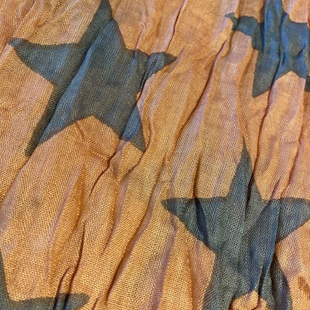 Skønt tørklæde fra Amust. Tørklædet er i 100% viskose crepe kvalitet og har grålige stjerner på en fin duset rosa baggrund.