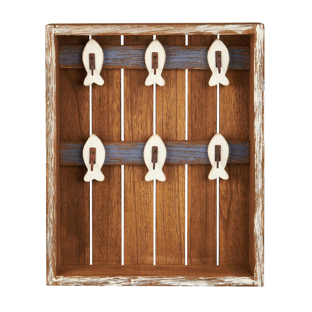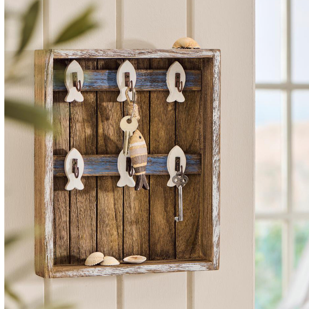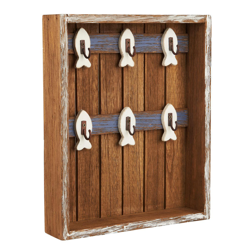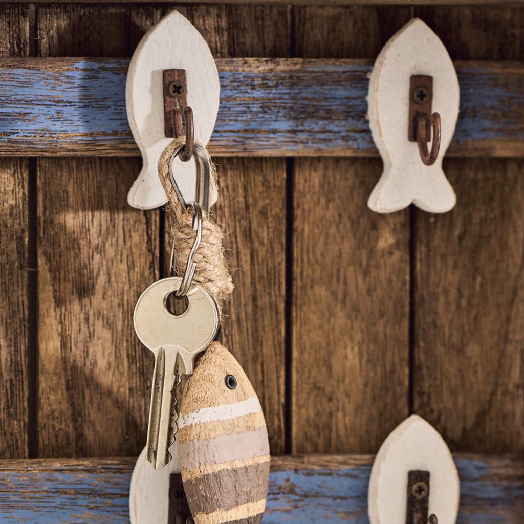 Sødt nøgleskab i træ med små fine hvide fiskekroge. Skabet er uden front.