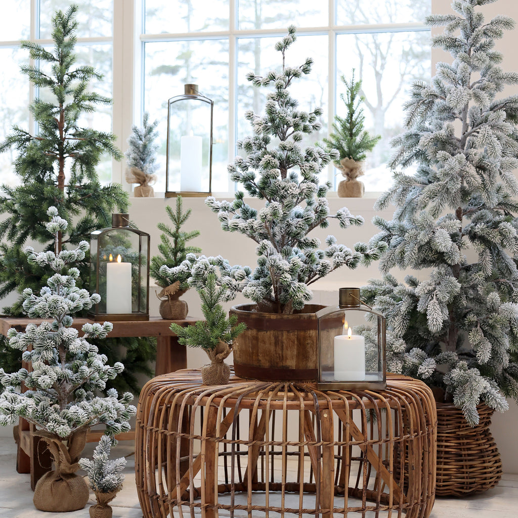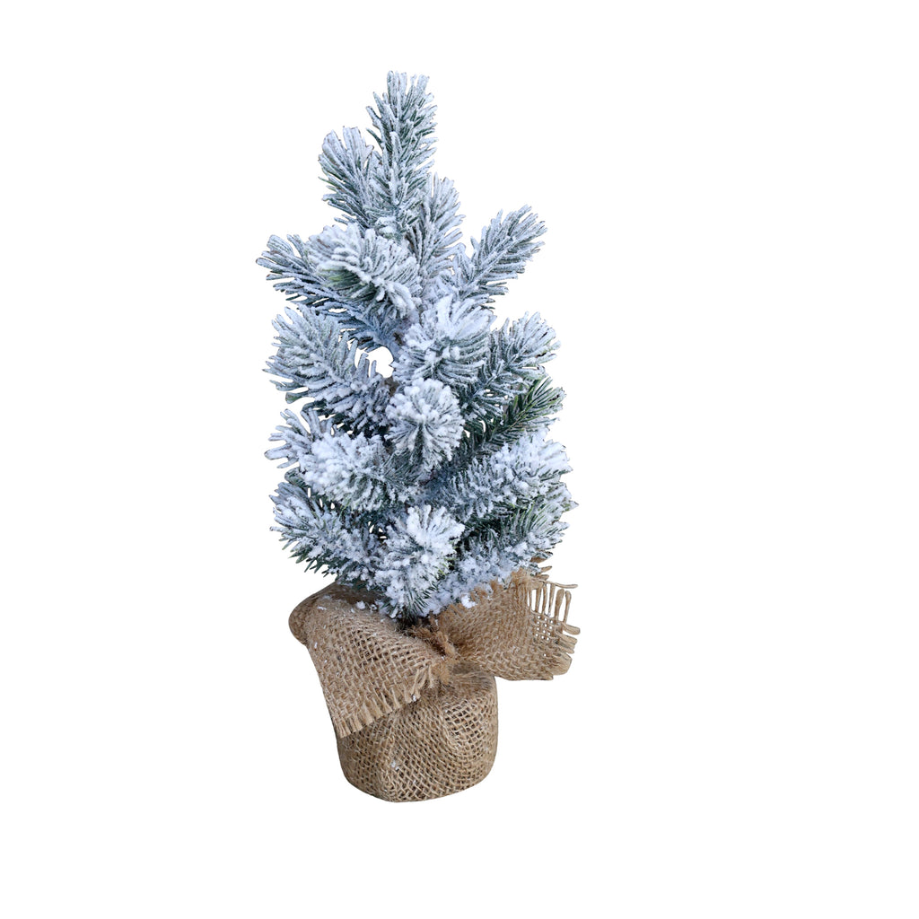 Dekorativt Fleur grantræ med sne i jutepose.