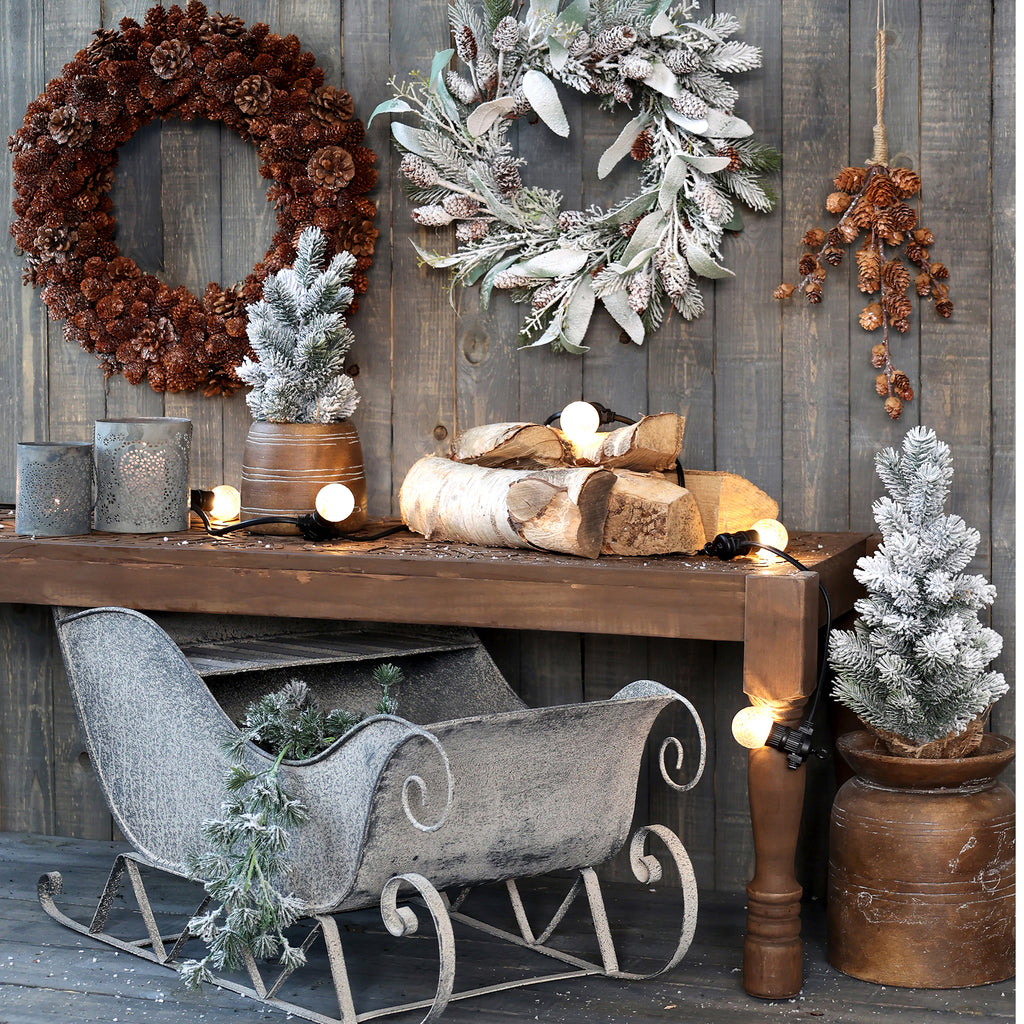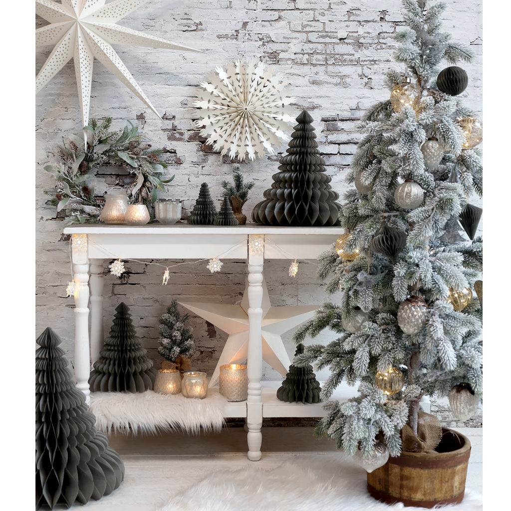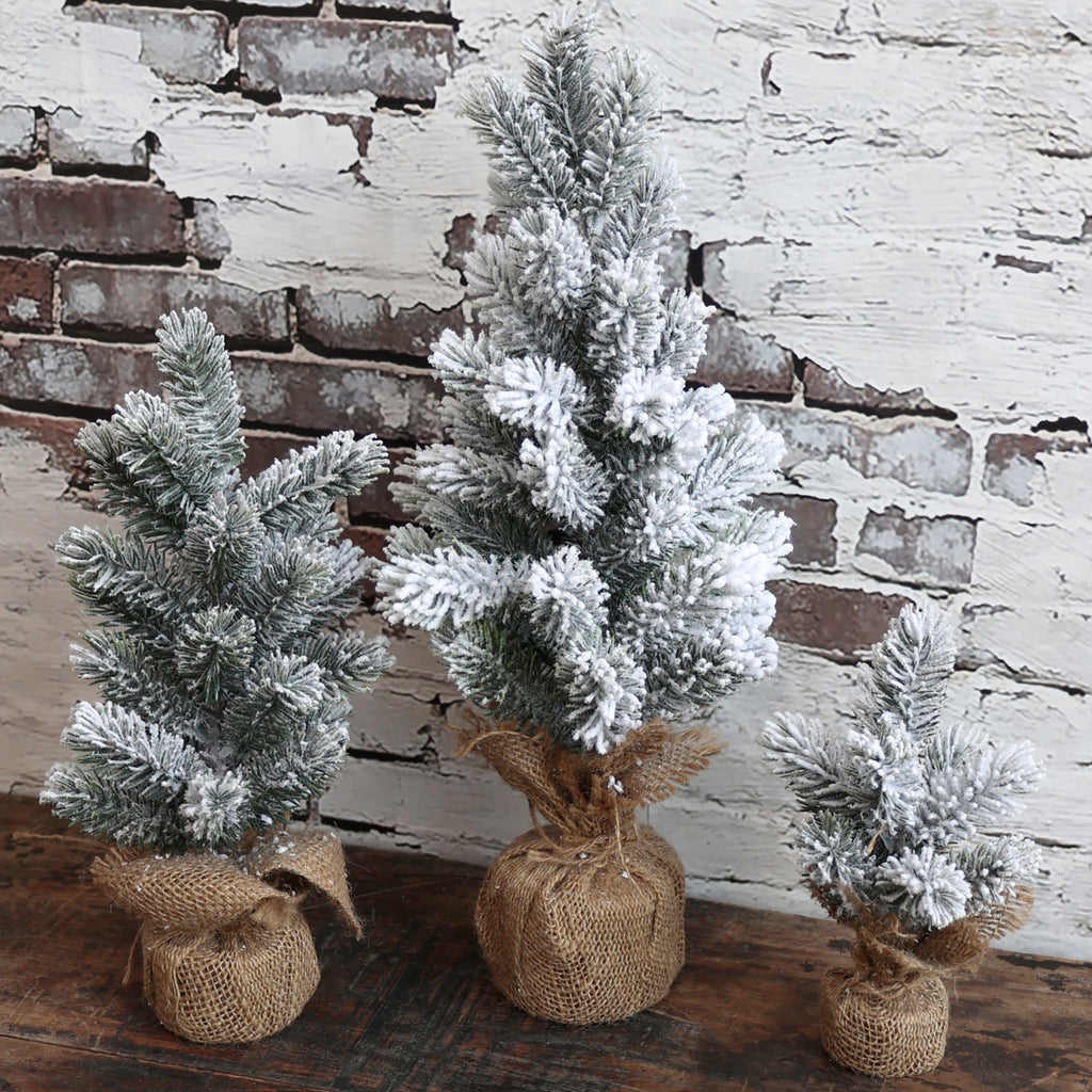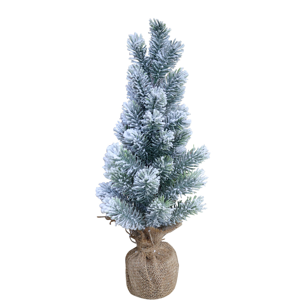 Dekorativt Fleur grantræ med sne i jutepose.