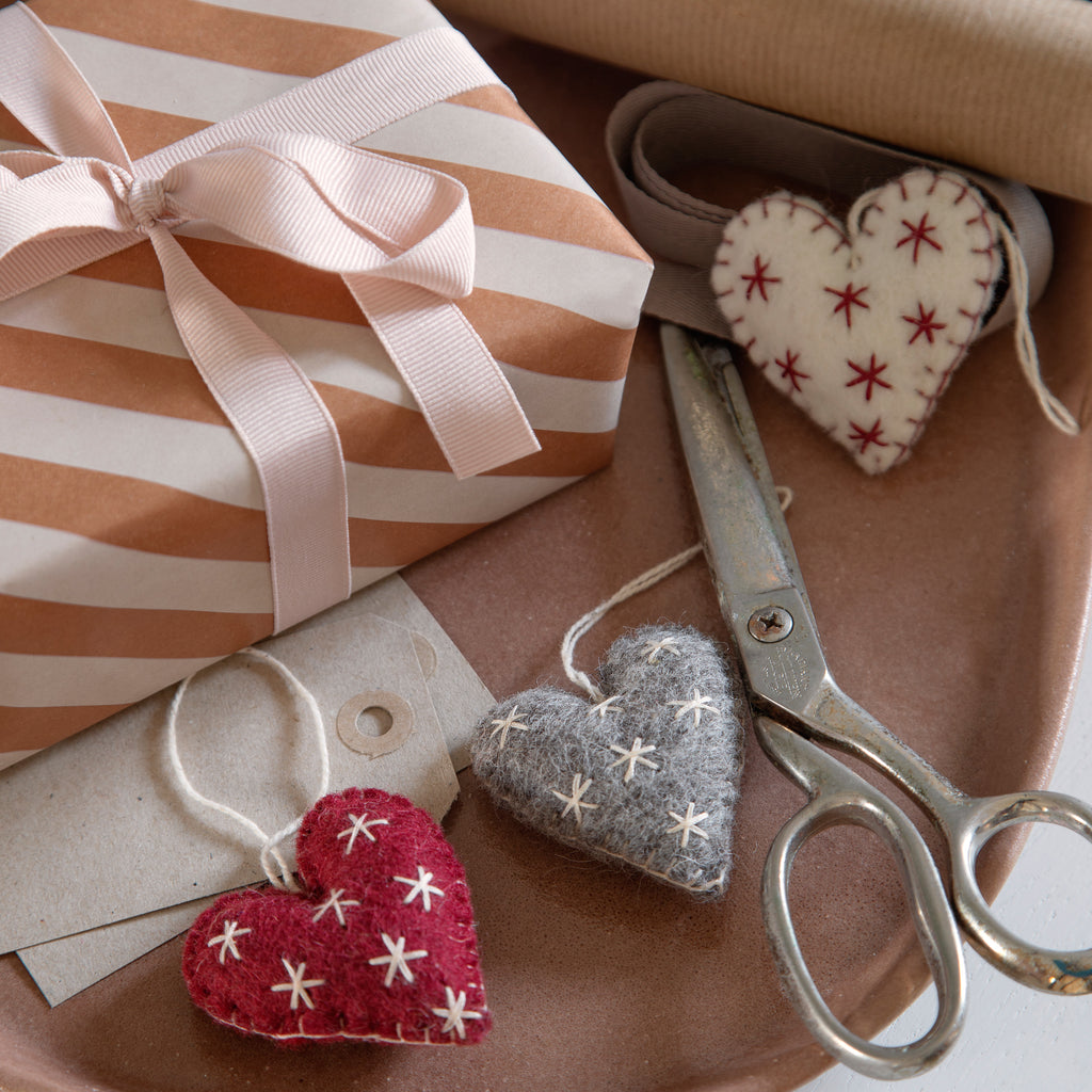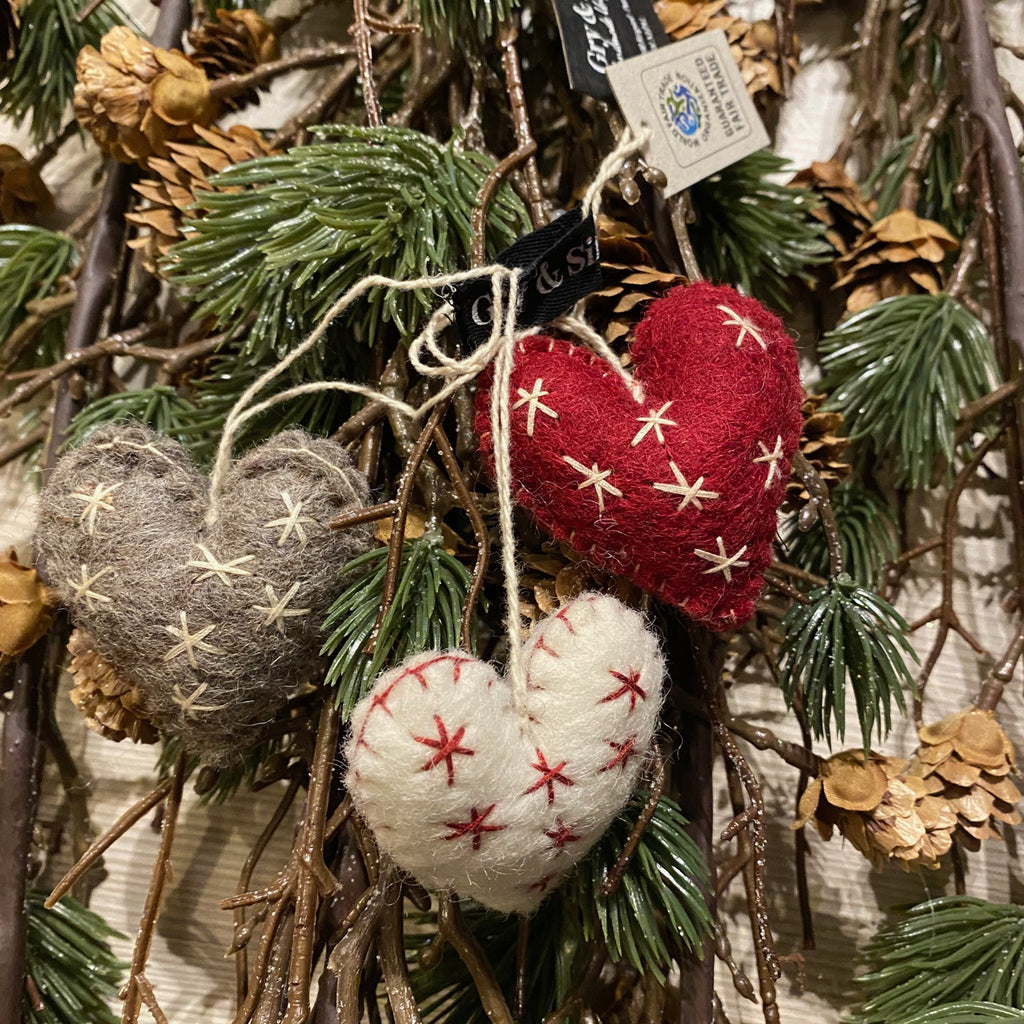De fineste små filtede hjerter til at hænge på træet eller i juledekorationerne. Sæt af 3 stk.