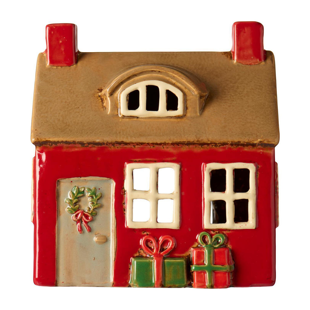 Flot og charmerende fyrfadshus i rødt glassur og med dørkrans og gaver. Skaber den perfekte julestemning. Brug fyrfadslys eller en fin julekæde til at lyse huset op.