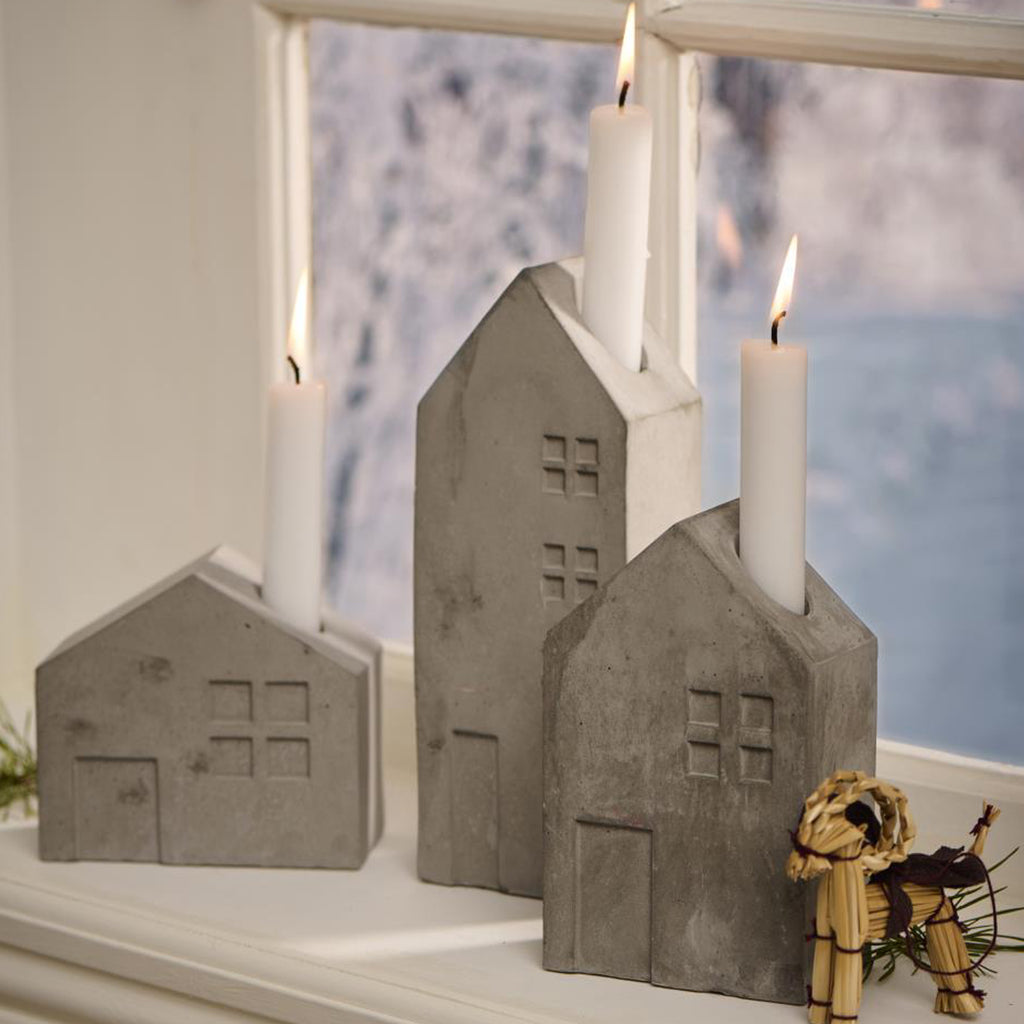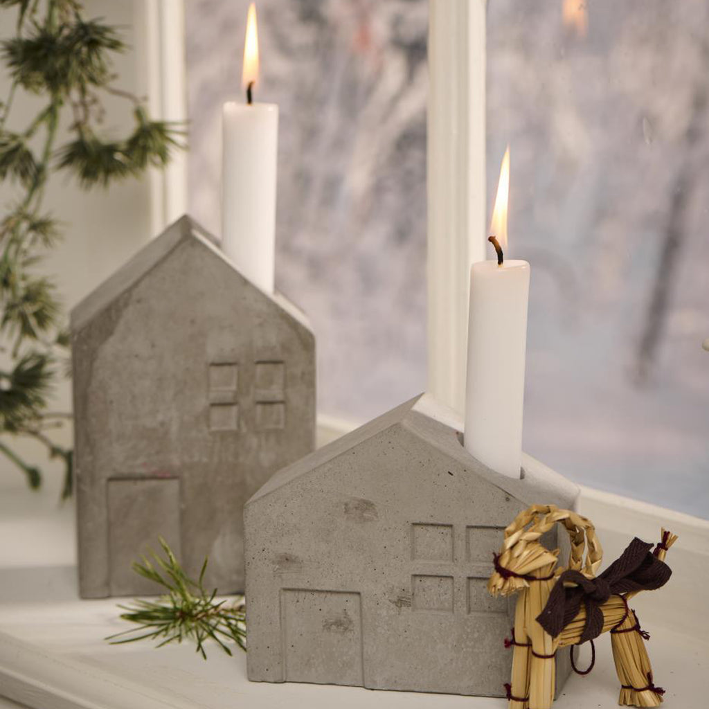 Lysestage, fremstillet af beton, er formet som et hus og perfekt egnet til lys med en diameter på 2,2 cm. Dens enkle, men charmerende rustikke design bringer en rolig og moderne atmosfære til ethvert hjem. Betonmaterialet giver holderen et robust og tidløst udtryk, der komplementerer en række forskellige indretningsstile. Den ser særligt godt ud på et spisebord, på en hylde eller som et dekorativt element i en vindueskarm.