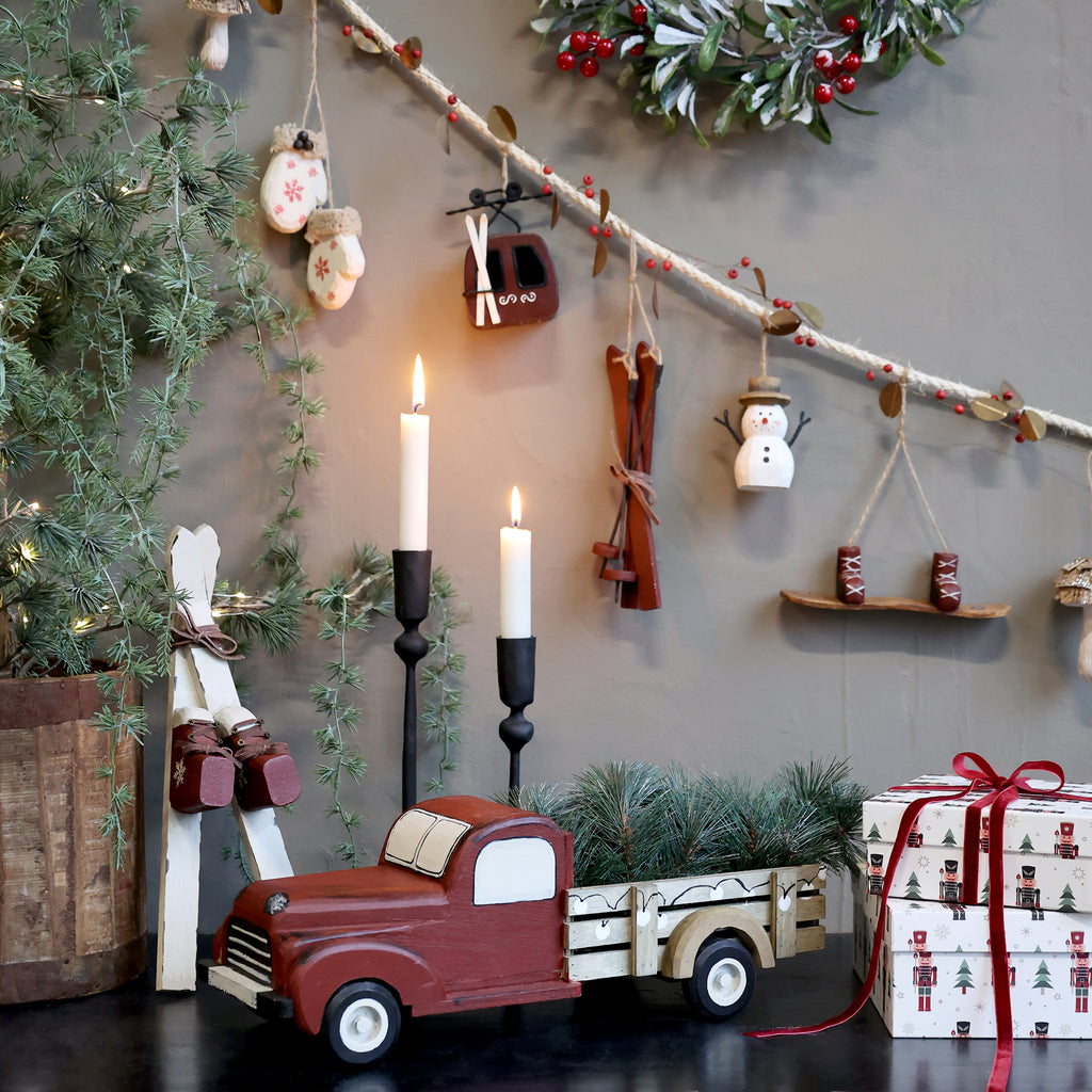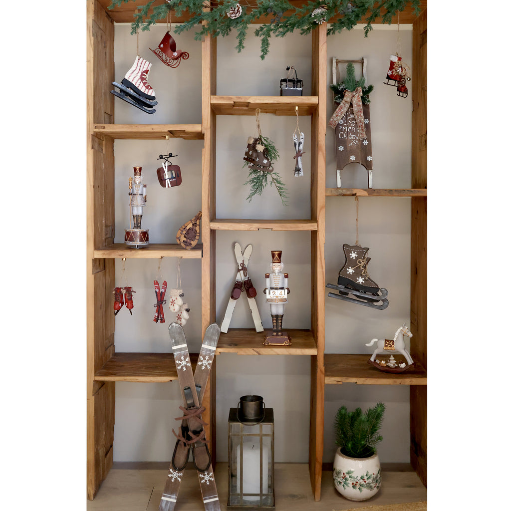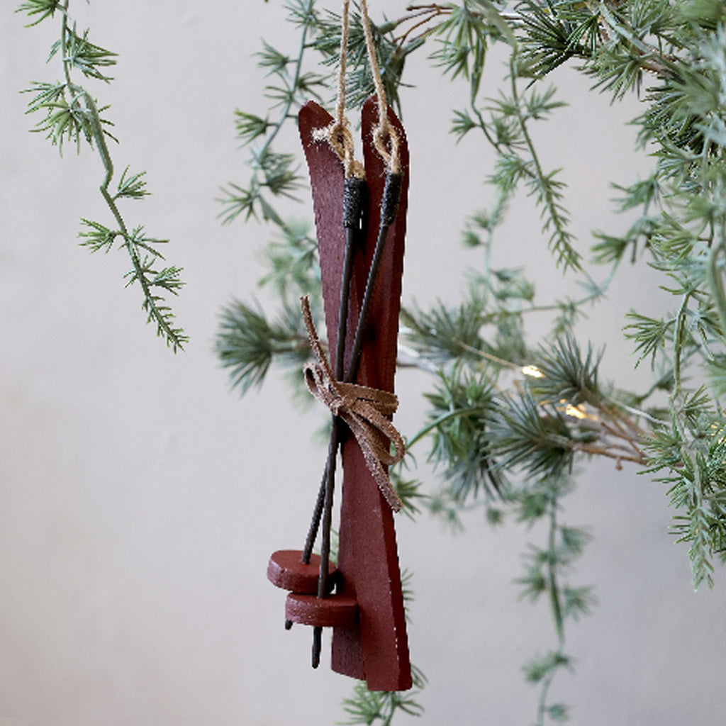 Fine håndmalet vintage træ ski med stave. Super søde til at dekorere hjemmet i den hyggelige vinter- og juletid. De leveres med jutesnor, så du kan også hænge dem på en gren eller på juletræet.