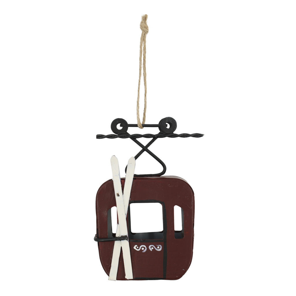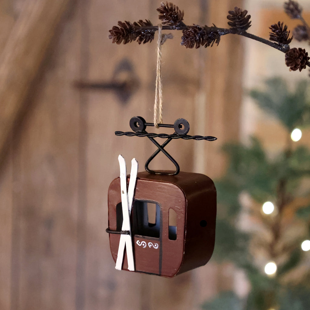 Fin håndmalet vintage ski lift med jutesnor til ophæng.