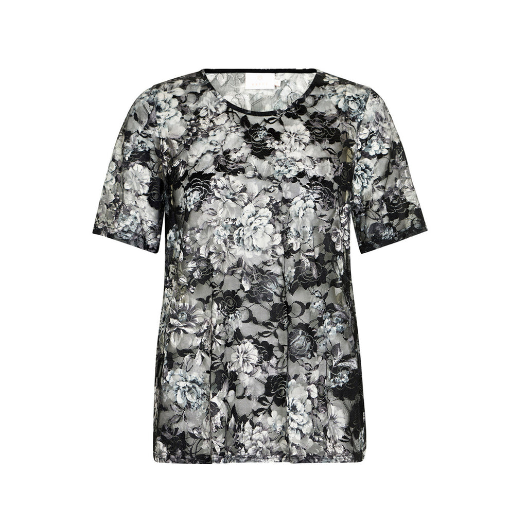 Smuk blonde bluse med print ovenpå blonden. Blusen har korte ærmer og rund hals. Kvaliteten er elastisk og den har normal pasform.