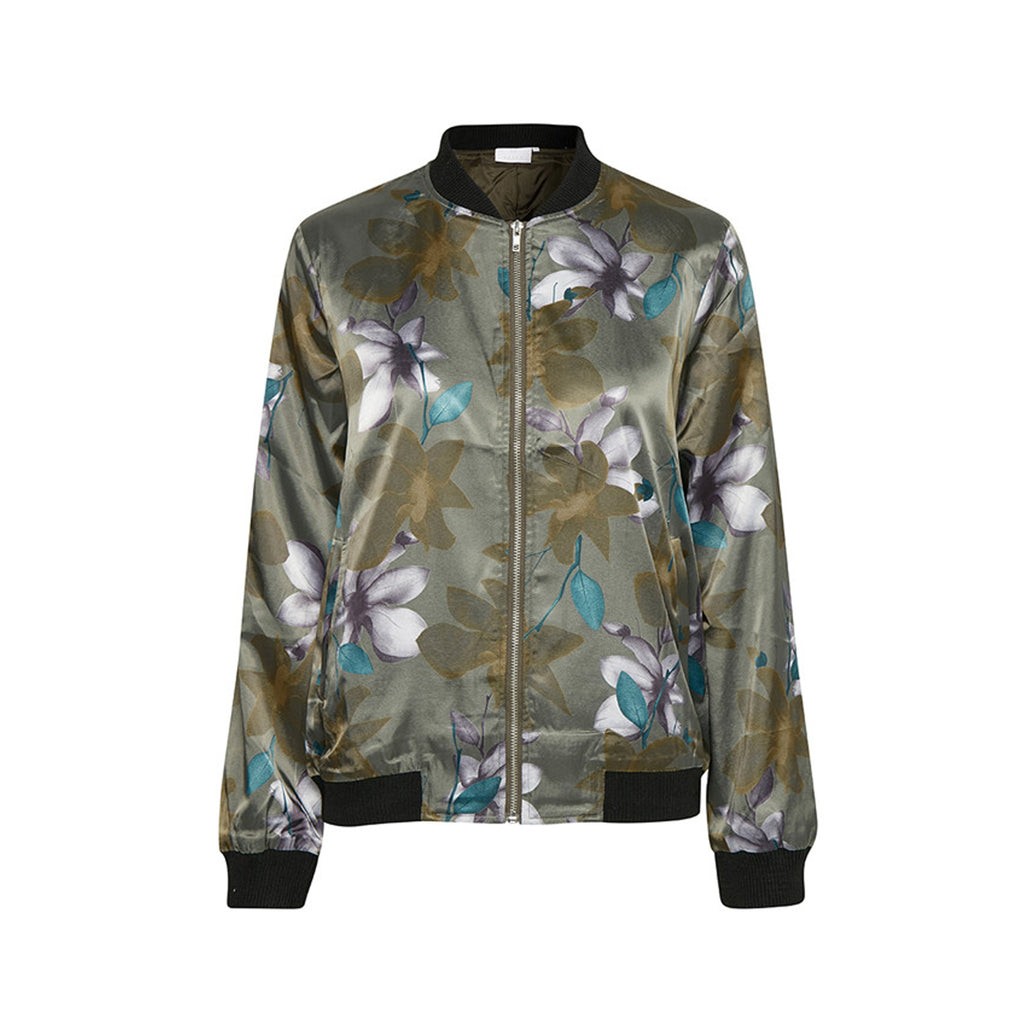 Smart bomber jakke med blomsterprint i en shiny kvalitet. Jakken har rib ved ærmerne og forneden samt lynlås og to sidelommer. Længden går til hoften.