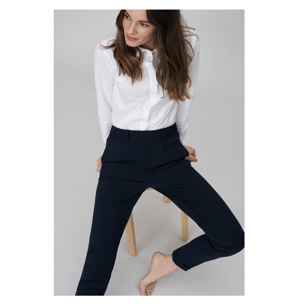 Kaffes kendte Jillian bukser med en vævet kvalitet foran og en strikket jersey bagpå, som giver dem et casual udtryk. Bukserne har elastik i taljen samt bæltestropper. Bukserne har lommer i siderne og paspelommer bagpå.