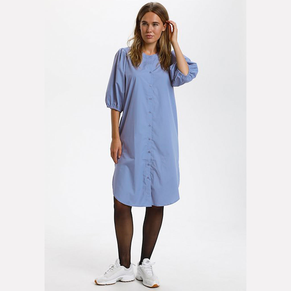 Flot og elegant gennemknappet skjorte kjole. Kjolen har 1/2 ærme og et løst snit. Brug den åben, lukket og evt. med bælte - med sneakers, støvle eller sandal. Mulighederne er mange!