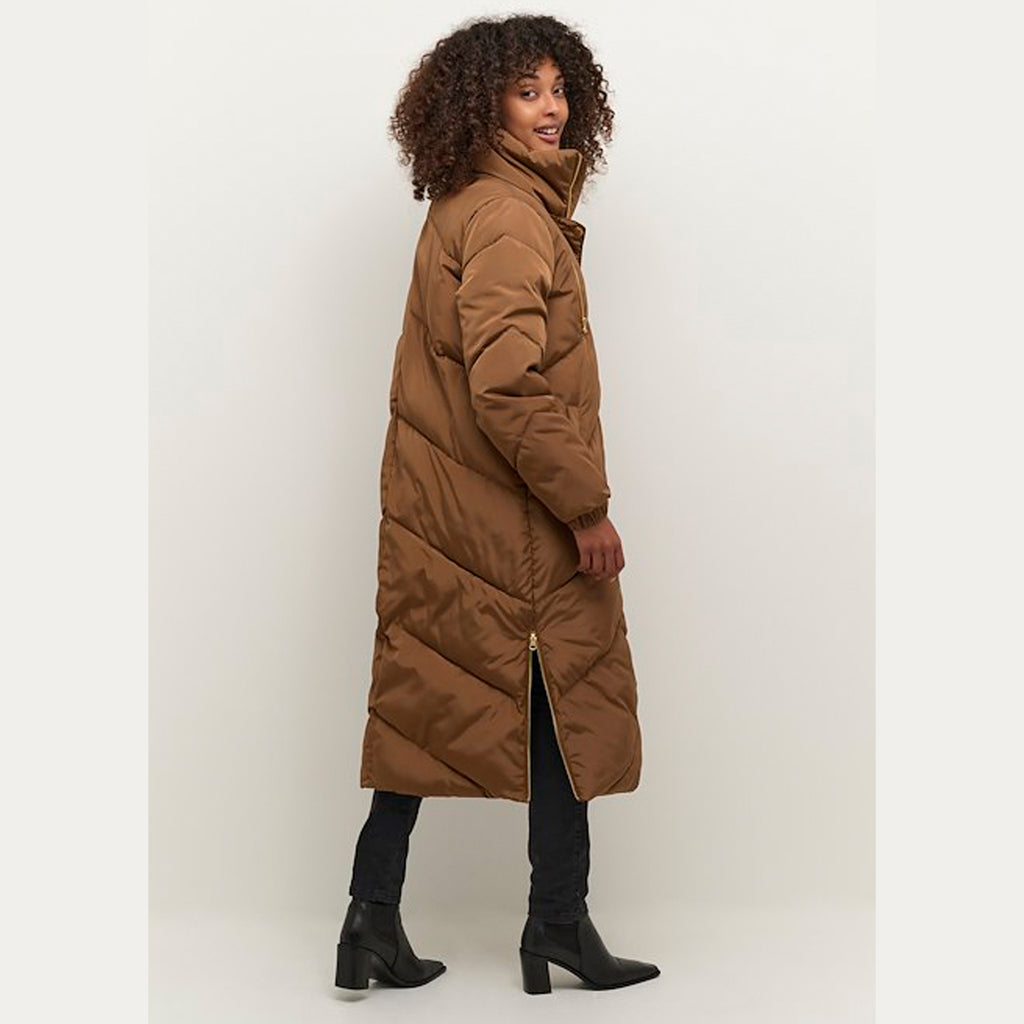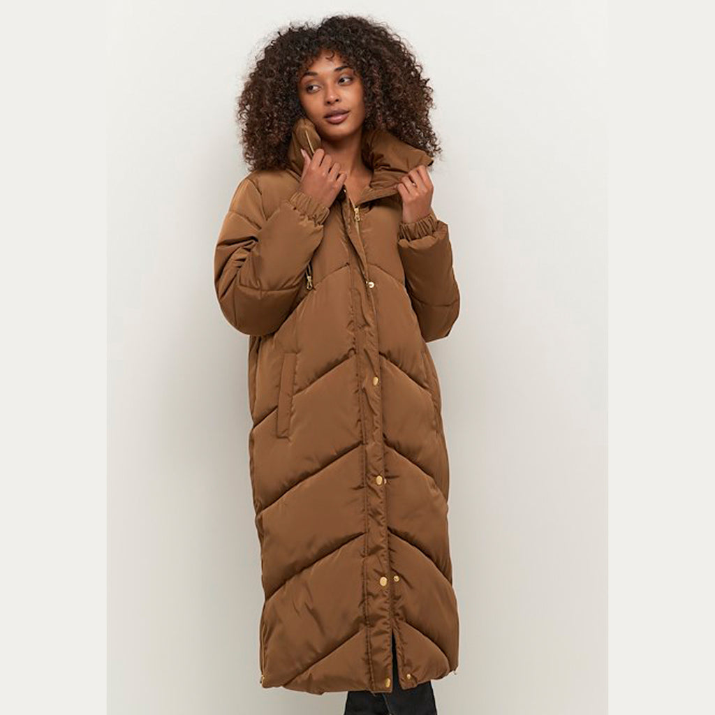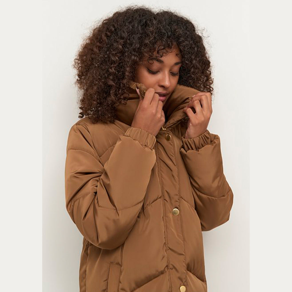Super lækker lang jakke med stor krave, som både kan lynes op om halsen eller vippes ned som en pæn krave. Jakken har lynlås og knapper samt lommer og brystlommer.