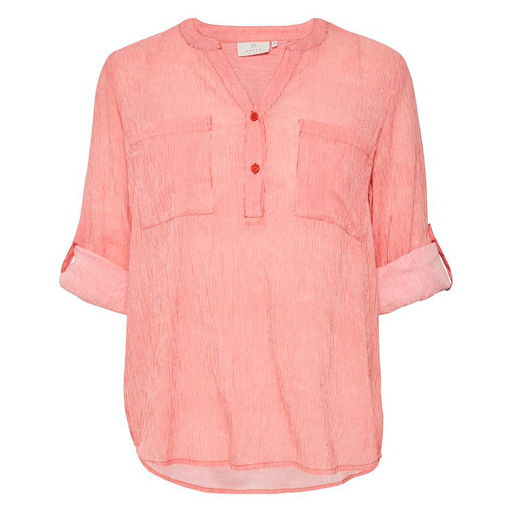 Skøn bluse med stolpelukning og knapper i fint ganske smalriflet stof. Coral og hvide striber, lettere kreppet kvalitet. V-hals, brystlommer, lange ærmer der kan holdes oppe med strop.