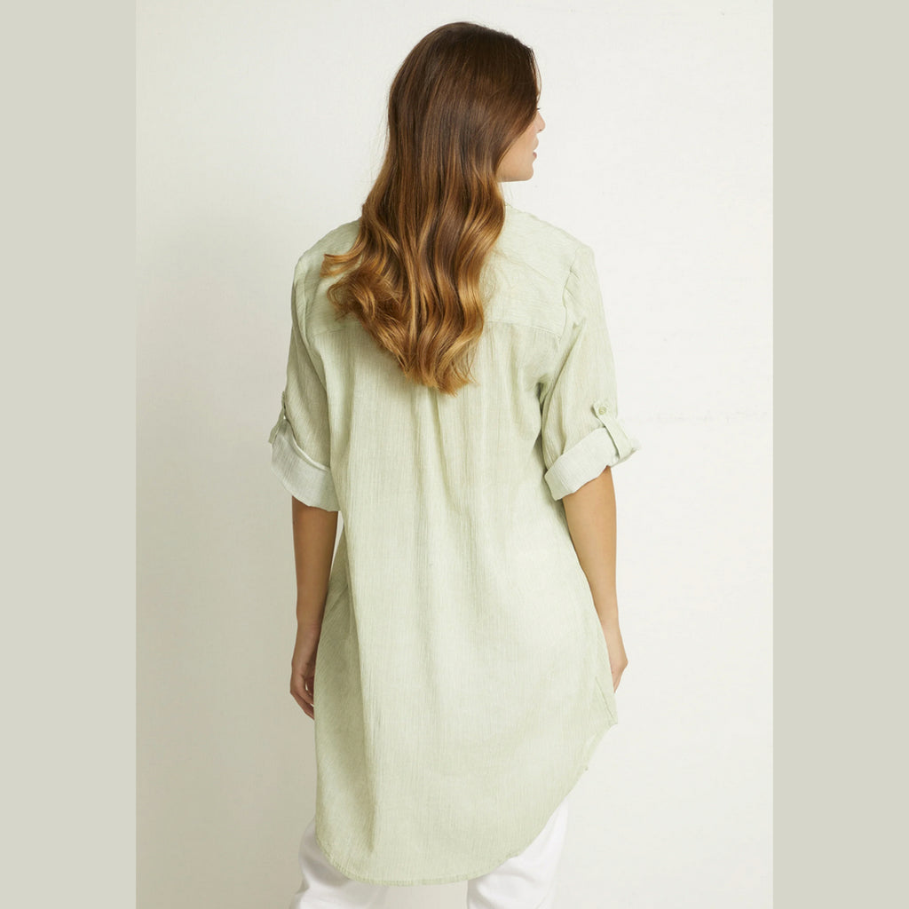 Skøn gennemknappet skjorte kjole i fint ganske smalriflet stof. Grøn og hvide striber, lettere kreppet kvalitet. Skjortekrave, brystlomme, 3/4 ærmer der kan holdes oppe med strop.
