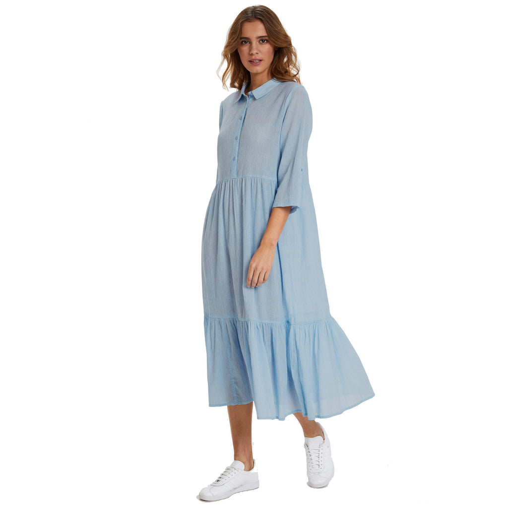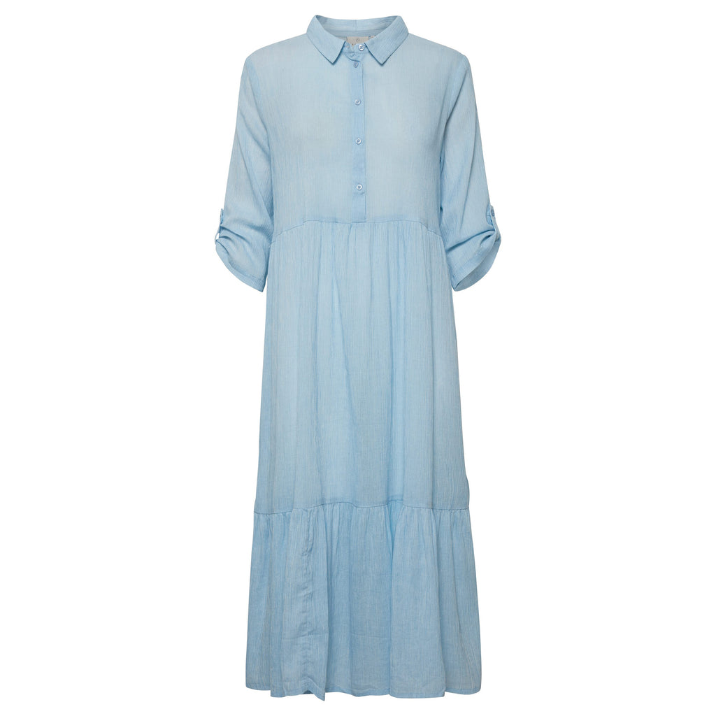 Skøn kjole i fint ganske smalriflet stof. Lyseblå og hvide striber, lettere kreppet kvalitet. Skjortekrave, lange ærmer der kan holdes oppe med strop. Overskåret i livet og lagdelt. Luftig og pivdejlig.