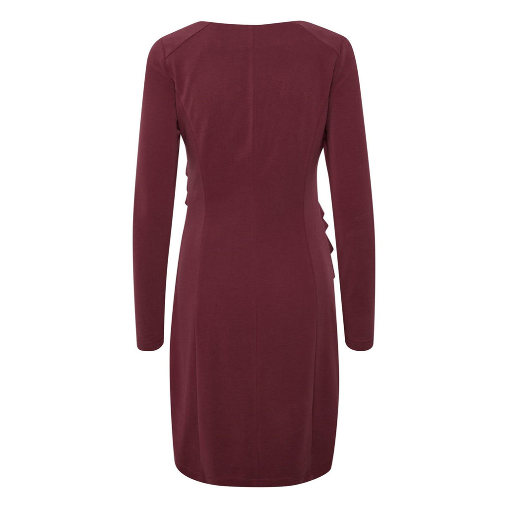 Smuk blød kjole med wrap og rynk i siden - mærkes lidt fløjlsagtig. Kjolen har v-hals og lange ærmer – og følger kroppen. Farven er en dyb vinrød også kaldet zinfandel.
