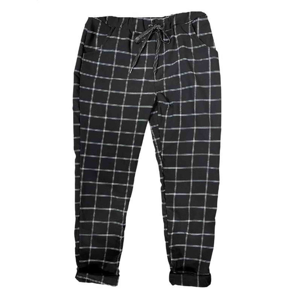 Smarte sorte bukser i tern. Bukserne har elastik i taljen og snører - og har fint med stræk. Bukserne er onesize og passer str. 36-42.