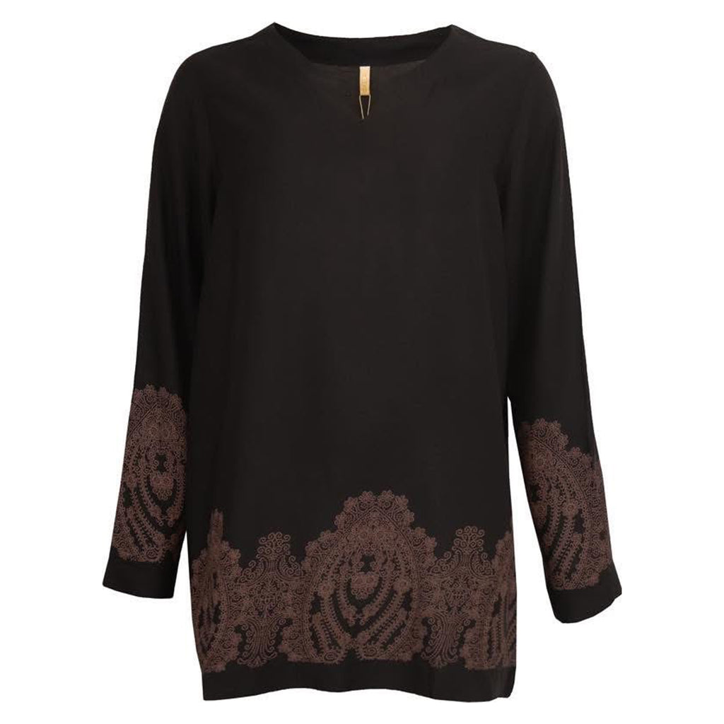Sort bluse/tunika med en smuk bort forneden. Blusen har en fin v-hals og lange ærmer også med den fine bort.