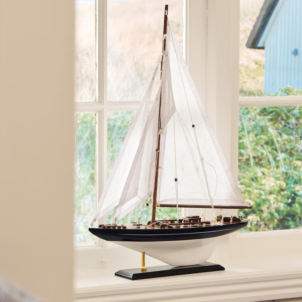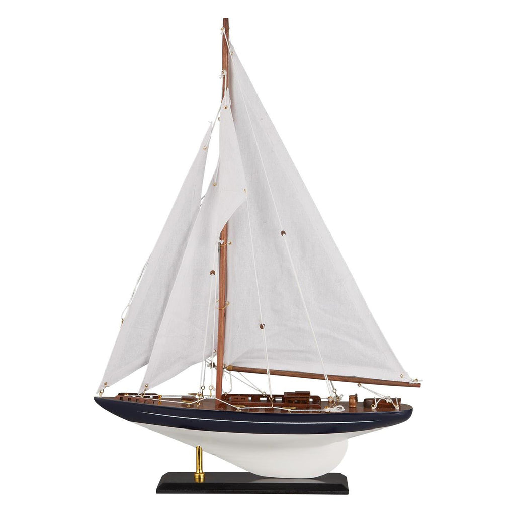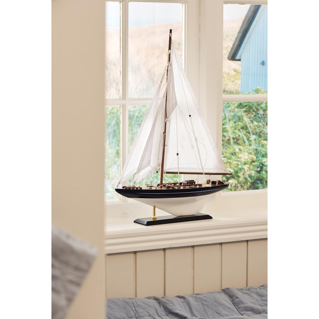 Stort detaljeret sejlskib med mørkeblåt skrog og hvide sejl. Skibet skal leveres usamlet dvs. sejlene skal monteres. Skibet pynter i enhver indretning og skaber hygge.