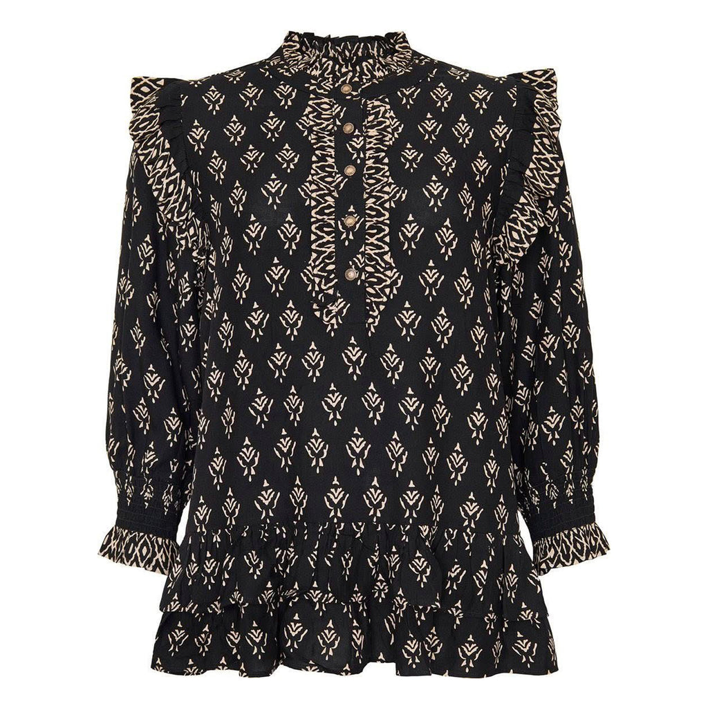 Feminin og afslappet bluse med de fineste detaljer og dekorative metal knapper ved stolpelukningen. Bluse har v-hals med dekorativt flæselook ved stolpelukningen, langs halsen, over skuldrene og ved hoften. Blusen har en afslappet pasform, har 3/4 ærme med smock elastik.