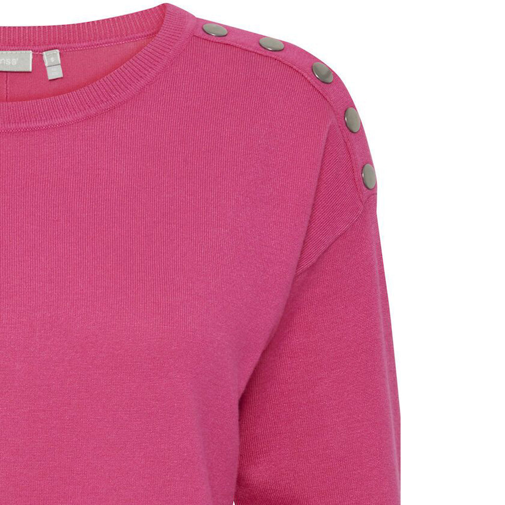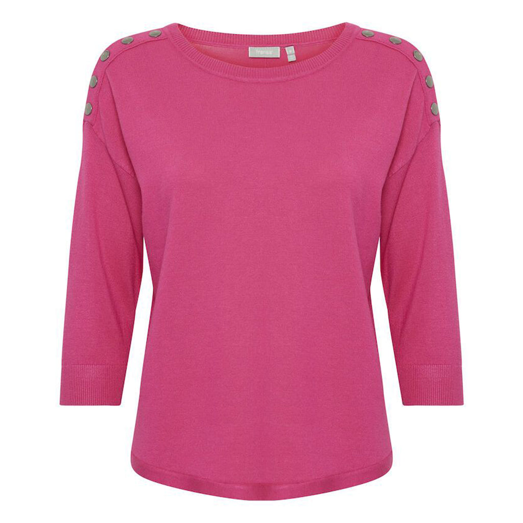 Fin strik bluse med rund hals og 3/4 ærmer. Blusen har en en fin detalje med knapper på skulderen. Pulloveren er behagelig og blød.