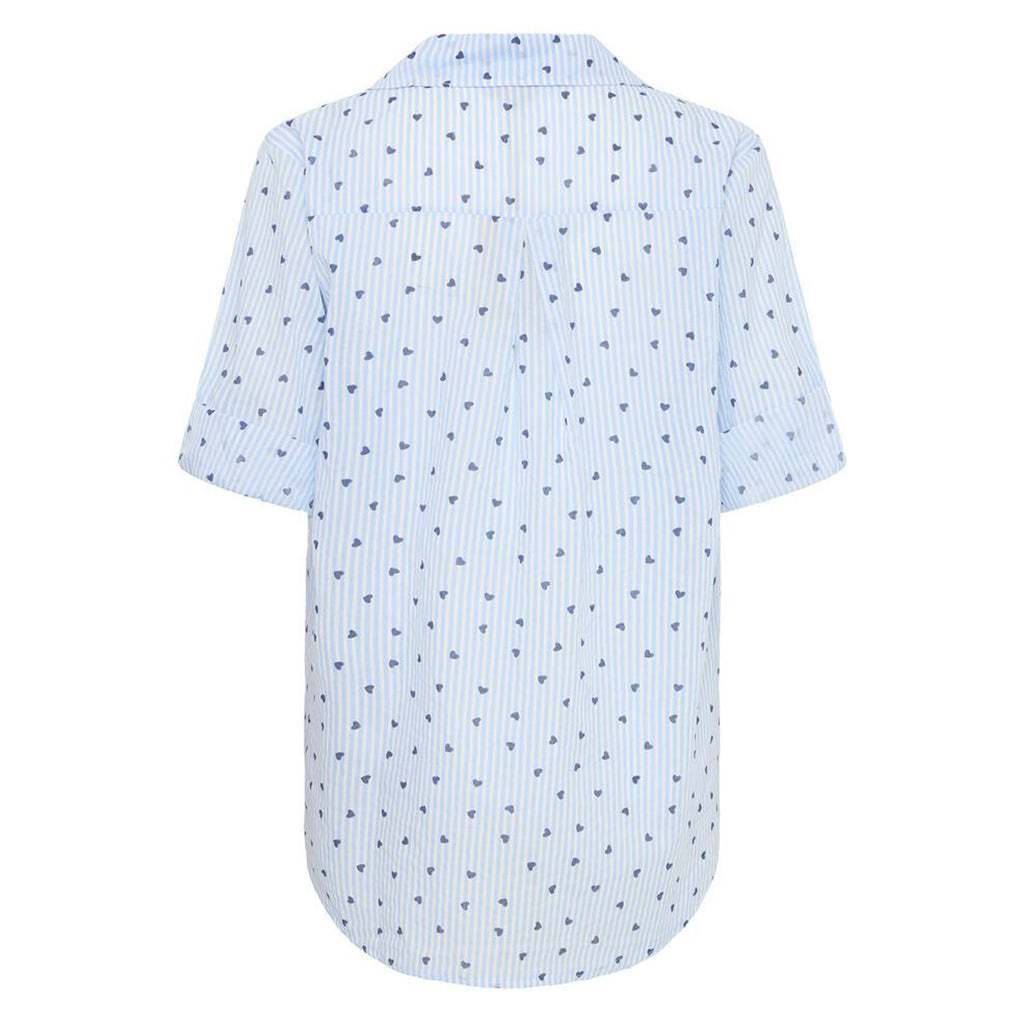 Sød gennemknappet bomulds skjorte bluse med 3/4 ærme med opsmøg. Blusen har en fin krave og er i et smukt mælkedrenge stribet mønster med hjerter. Skjorten har en flot detalje med læg på ryggen og er lidt længere i bag.
