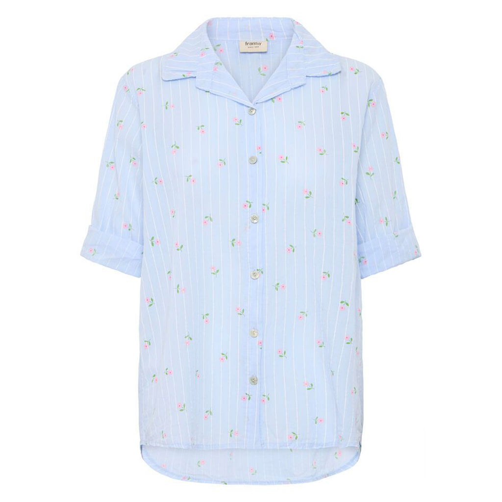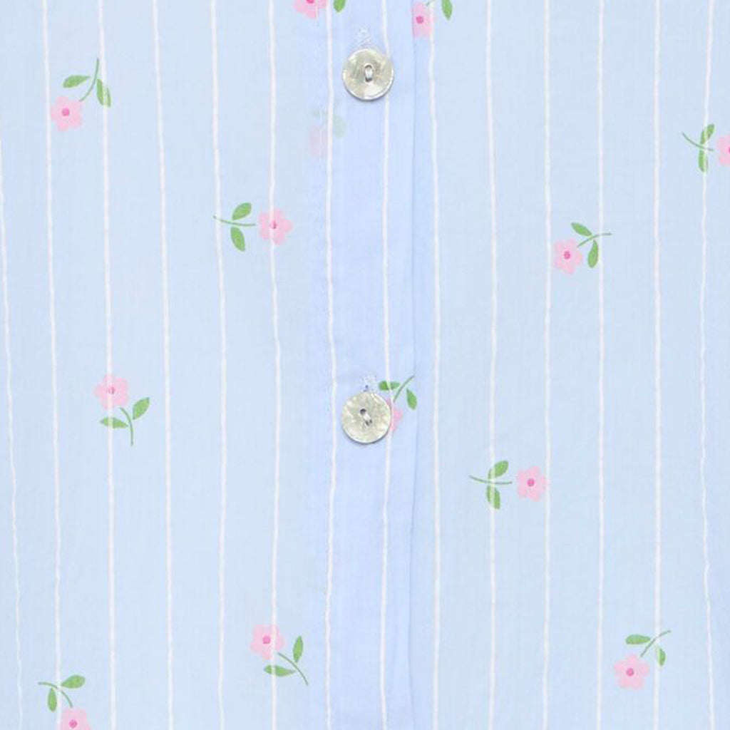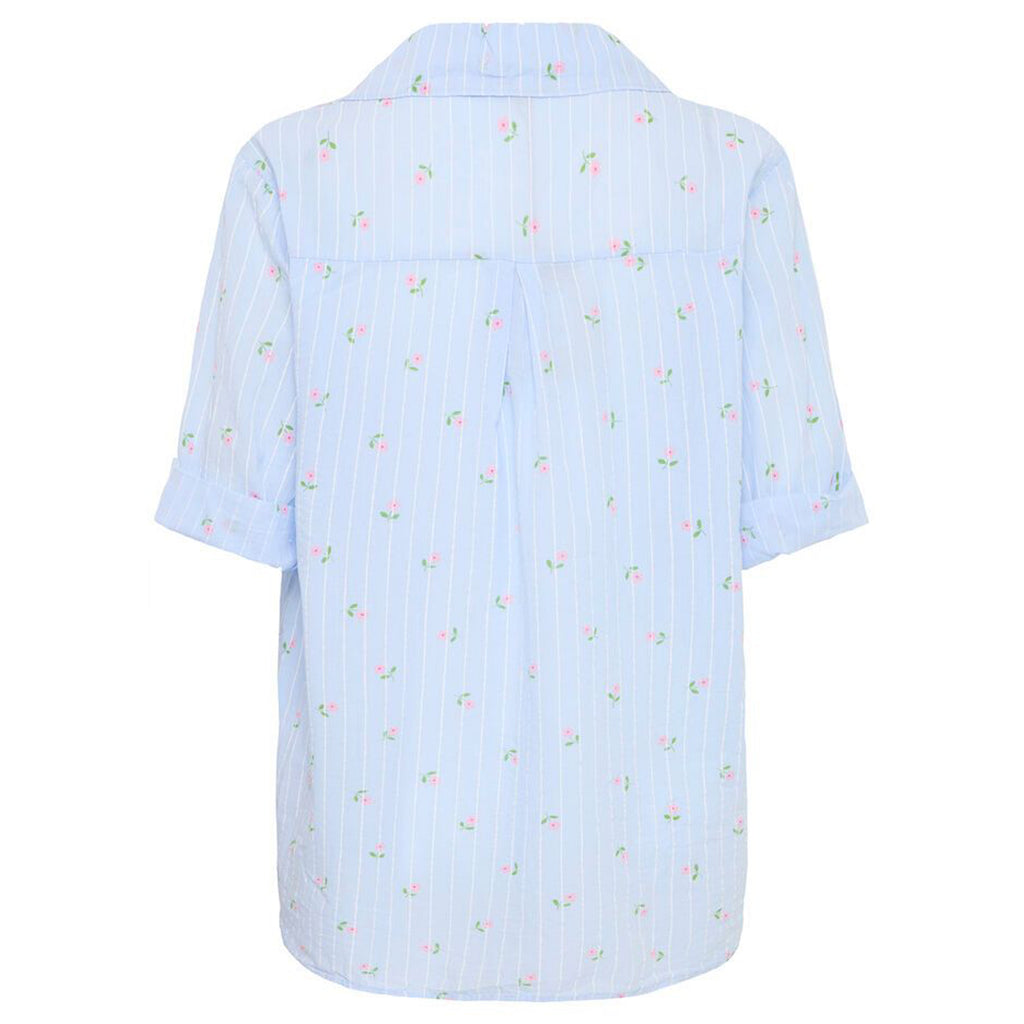 Sød gennemknappet bomulds skjorte bluse med 3/4 ærme med opsmøg. Blusen har en fin krave og er i et smukt mælkedrenge stribet mønster med blomster. Skjorten har en flot detalje med læg på ryggen og er lidt længere i bag.