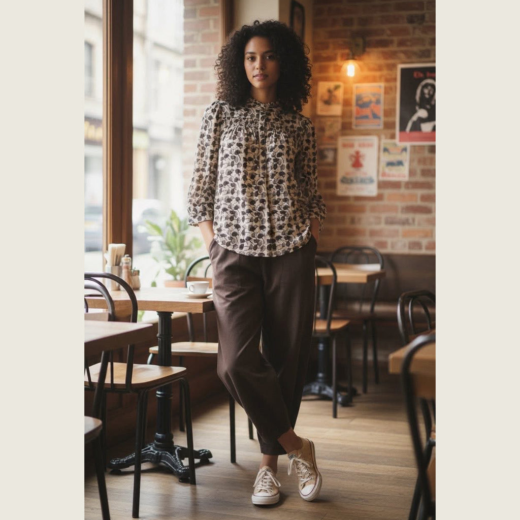 Sød bluse med mange fine detaljer. Blusen har en fin stolpelukning og et stykke med smock over brystet, som får blusen til at falde pænt. 3/4 ærme